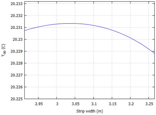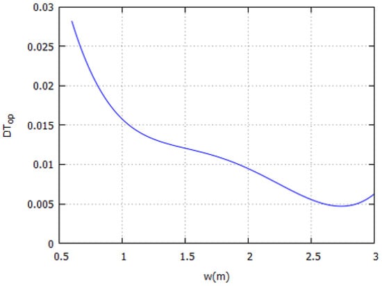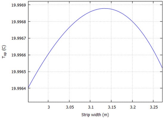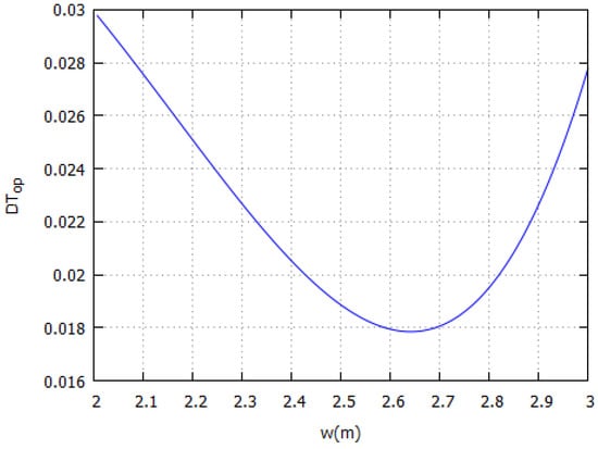 More importantly, we find a very distinct maximum for between 3 m and 3.1 m, Figure 16. By means of the analytical form of the solution, we can compute its location precisely at m, see Figure 17. Notice also that, qualitatively, the operative temperature difference between radiators and a fully covering UFH is comparable to that obtained in the experimental paper [].