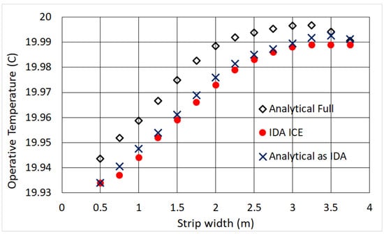 On the other hand, for the "Analytical as IDA ICE" points, while still computing analytically, we use Equations (3) and (5), consistently with the software. This provides validation of both our view factors and the temperature interpolations , where x is a length that is specific to the particular case (either a or b). The interpolations are implemented towards a more general form of the operative temperature than by using the raw data for the surface temperatures. This way, instead of calculating for each point, we can write and accordingly formulate general considerations and predictions on the operative temperature for any possible configuration consistent with the test room setup. In the case of UFH and ceiling heater, the "square" configuration consists of a square heater placed under the floor or ceiling surface, centred in the middle of the room, where the user is sitting. The “strip” configuration instead considers a heated strip running from the cold (or external) wall. Further descriptions are given in Section 3.2 and Section 3.3.