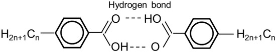 Figure 1 shows the molecular structure of the hydrogen-bonded LC. This material exhibited a thermotropic liquid crystalline phase due to the intermolecular hydrogen bonding between two identical molecules. Hydrogen bonding has an important role in supramolecular LCs [34]. In this study, a hydrogen-bonded liquid crystal (LC1) was introduced to a phase control device. LC1 is a mixture of molecules (as seen in Figure 1) that vary by alkyl chain length. We also studied a standard nematic LC (E44) for comparison.