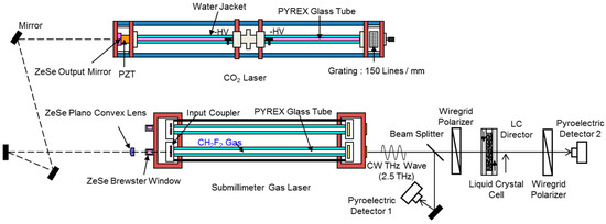 Figure 3 shows the experiment setup. In this study, the terahertz wave intensity profiles were measured by using an FIR CW laser as a signal source. This laser was the major source of a coherent CW with a powerful terahertz radiation above 0.3 THz. Here a CO2 laser was used for pumping the CH2F2 gas, and a frequency of 2.5 THz was used for our measurements. We placed the LC device between two wire-grid paralyzers, and the intensity of the terahertz wave was detected by a pyroelectric detector. To eliminate the influence of laser power variation, we checked the power of the THz wave by using pyroelectric detector 1 at all times. An accurate transmittance was obtained by using the intensity of pyroelectric detector 2 normalized by the intensity of detector 1.