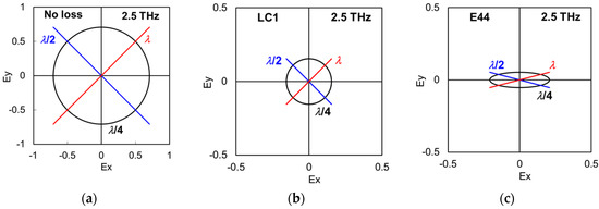 Simulation results of the polarization conditions of a transmitted terahertz wave. We set the absorption values for (a) zero (no loss), (b) LC1, and (c) E44. Retardation of the LC device was λ, λ/2, and λ/4.