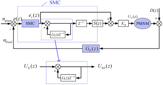 where GSMC(z) is the transfer function of the sliding mode control; GP(z) is the sensor transfer function; L(z) is a low-pass filter; KR is a gain coefficient; and D(z) is disturbances.
