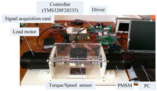 Simulations and experimental tests were carried out to investigate the above analysis and to verify the control performance. A laboratory prototype electric drive was used for the experimental validation of the proposed control algorithm. The platform used for the experiments is shown in Figure 4. The system contains a load that attaches to the PMSM, a servo controller, and an encoder. The core of the main control board is a DSP microprocessor; its specific model is TMS320F28335.