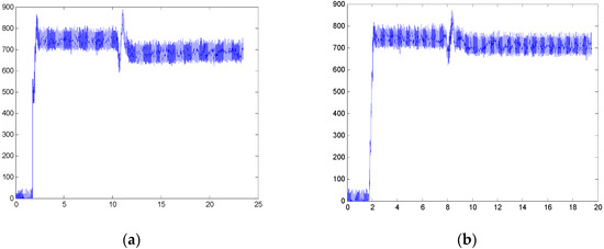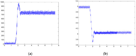 The actual rotor speed for a traditional SMC during the process of startup and running of the motor is shown in Figure 6a, while Figure 6b shows the corresponding output torque under the same condition. As seen from the pictures, the overshoot is approximately 30% in the process of startup. Simultaneously, there is a large overshoot in the corresponding output torque. Figure 7a,b shows the actual rotor speed and the corresponding torque for the proposed SMC during the startup and running period of the motor, respectively. The results show the speed and torque errors are approximately 7% and 3%, respectively.