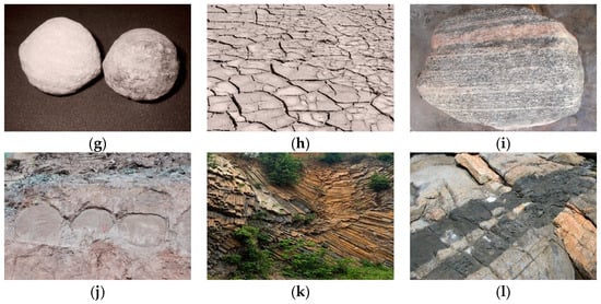 Samples of geological structure images: (a) Anticline; (b) Ripple marks; (c) Xenolith; (d) Scratch; (e) Ptygmatic folds; (f) Fault; (g) Concretion; (h) Mudcracks; (i) Gneissose structure; (j) Boudin; (k) Basalt columns; (l) Dike.