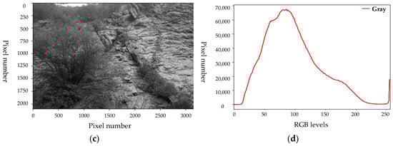 It is necessary to make data preprocessing in images classification. Some feature pre-processing methods [,] were adopted to improve the performance of the model. We applied two direct and straightforward preprocessing methods to extract features in images as the input of KNN, ANN, and XGBoost. The first method is to convert pixels in each image into a row vector directly; the second method is to build the histogram of pixels based on their statistical characteristics, as shown in Figure 2. In Figure 2b,d, x-axis means the range of pixels, which is [0, 225]; y-axis means the numbers of pixels at each level. The color images have three channels, namely red, green, and blue; the grayscale images just have one channel-grayscale. In Figure 2b, the red, green, and blue lines refer to the numbers of the pixels at R, G, and B levels. In Figure 2d, The red line refers to the numbers of the pixels at the grayscale level. In Figure 2a,c, the x- and y-axis measure the size of the photo.