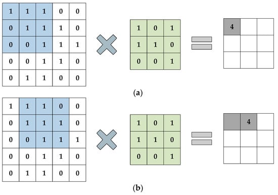 As shown in Figure 4, the sizes of the image and convolutional layers are 5 × 5 and 3 × 3, respectively. There are nine parameters in the convolutional layer, namely the weight matrix. The nine parameters mean nine neurons. According to the sizes of image and kernel, the output is going to be a 3 × 3 matrix, which is called the feature map. In the first step, the neurons were connected to the receptive field on the image; then it slides to the next region by one stride in the second step, as shown in Figure 4b. The computation was processed in each neuro as follows.