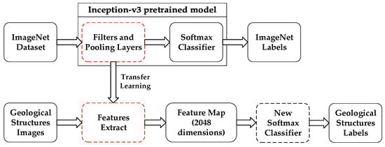 In this research, we established a transfer learning model based on Inception-v3 for geological structures with 12 labels. The test result showed a high accuracy of the model. Then we made a comparison between the identification model and the other four models, namely K nearest neighbors (KNN), artificial neural network (ANN), extreme gradient boosting (XGBoost) and CNN. The result showed the transfer learning model had a high accuracy on a small dataset. The machine learning method’s accuracy was poor because it is hard to extract accurate features of images from a pixel vector or histogram. CNN was overfitting strongly. Transfer learning based on deep learning model was an effective method for geological structure images classification. Moreover, Wu et al. [] applied the UAV and recognition model to detect rail surface defects. The retrained model in this research can also be combined with a UAV, which can be an assistant tool in the geological survey in further study.
