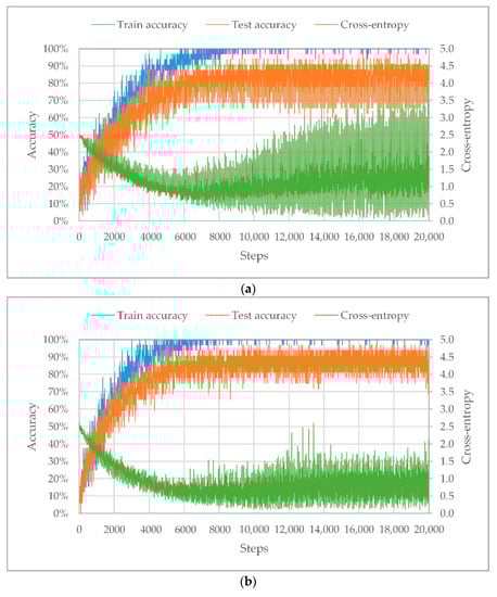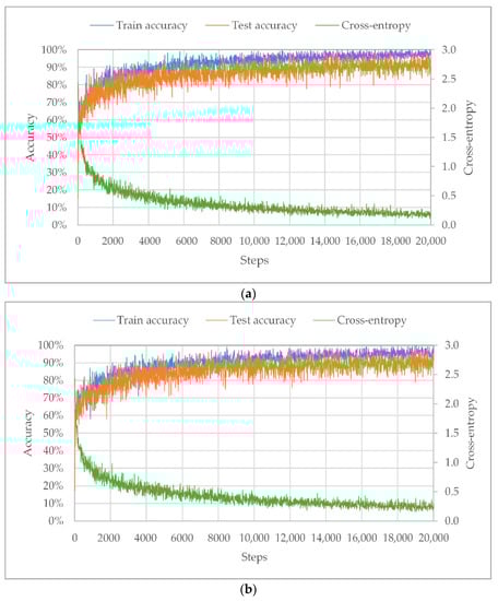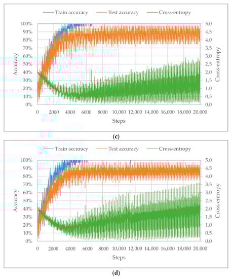 The training process of CNN was shown in Figure 8. Train accuracy, validation accuracy, and cross-entropy were also used to evaluate the model. Figure 8a–c are the results of the CNN with two, three and four convolutional layers on the color dataset; Figure 8d is the result of the CNN with three convolutional layers on the grayscale dataset. The effects of the three-layer CNN was the best, and the grayscale data was also trained by the CNN architecture, as shown in Figure 8d. The train accuracy was almost 100.0%, while the validation accuracy was about 85.0%, which indicated the model was overfitting.