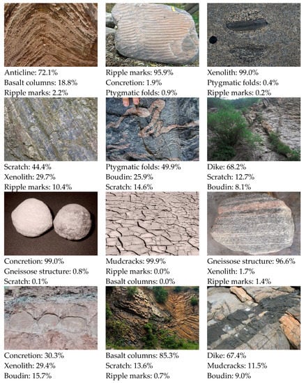 In this research, we collected 2206 geological structures images with 12 labels, including anticline, ripple marks, xenolith, scratch, ptygmatic folds, fault, concretion, mudcracks, gneissose, boudin, basalt columns, and dike. The dataset was collected from the geological survey and the internet []. In data collection, we tried to make each category cover images with different scales and sizes as many as possible. The resolution of the image is not limited. All the images are going to be processed at the same size before training. The numbers of images in each label are listed in Table 1. Figure 1 shows samples of the data.