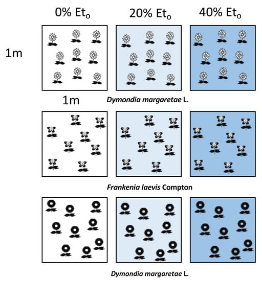Taking into account our previous study [43], we selected three different species: Dymondia margaretae Compton, Frankenia laevis L., and Iris lutescens Lam. (Table 1). We planted three species in different containers with a density of nine plants per square meter. We replicated each plot three times, once for every irrigation treatment, obtaining nine plots (Figure 1).