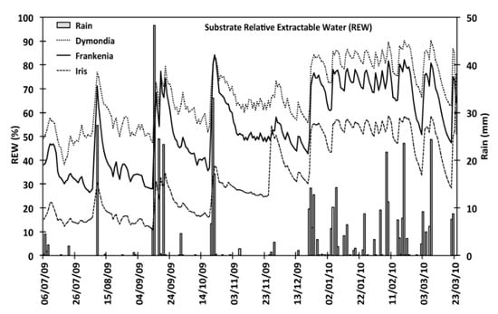 Relative extractable water (REW) of the substrate from July to March for all irrigation treatments in each species.