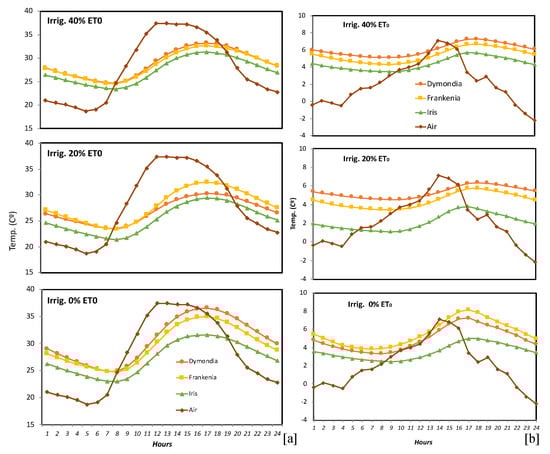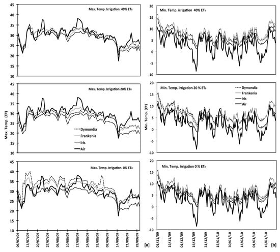 Temperature soil recorded for each species and irrigation treatments (0–20–40% ET0) in relation to air temperature: (a) maximum temperatures since July to September; (b) minimum temperatures since November to March.