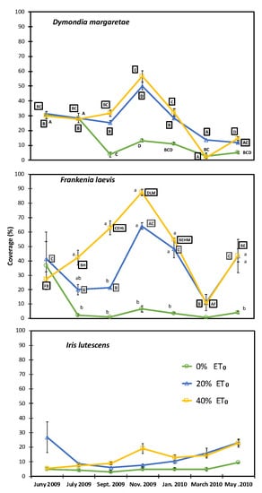 Annual vegetation cover for each species and irrigation treatments (0–20–40% ET0). Capital letters indicate significant differences throughout the trial period for the same treatment. Lowercase letters indicate significant differences between irrigation treatments in the same month.