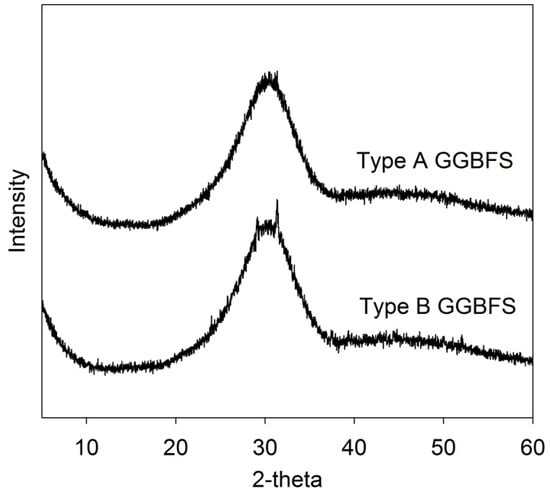 Crystallinity in the GGBFSs were examined using XRD (high-power X-ray diffractometer; Rigaku, Tokyo, Japan), and the results are displayed in Figure 1; type B had a weak reflection of akermanite (Ca2MgSi2O7), but its intensity was not significant, while type A consisted of only an amorphous phase.