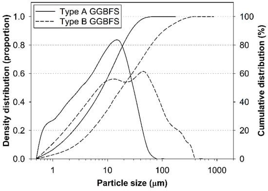 Particle size distributions of the raw GGBFSs were examined using a laser scattering particle size analyzer (HELOS/RODOS H1433; Sympatec, Clausthal-Zellerfeld, Germany) as shown in Figure 2. The results showed that type B was coarser than type A. The Blaine fineness of type A and B was respectively 16,189.63 and 7310.36 cm2/g.
