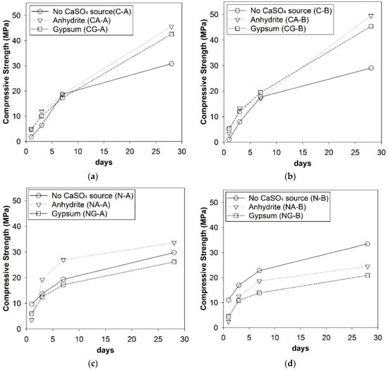 Compressive strength development of hardened paste samples with/without calcium sulfates: (a) CaO-activated type A GGBFSs, (b) CaO-activated type B GGBFSs, (c) NaOH-activated type A GGBFSs, and (d) NaOH-activated type B GGBFSs.