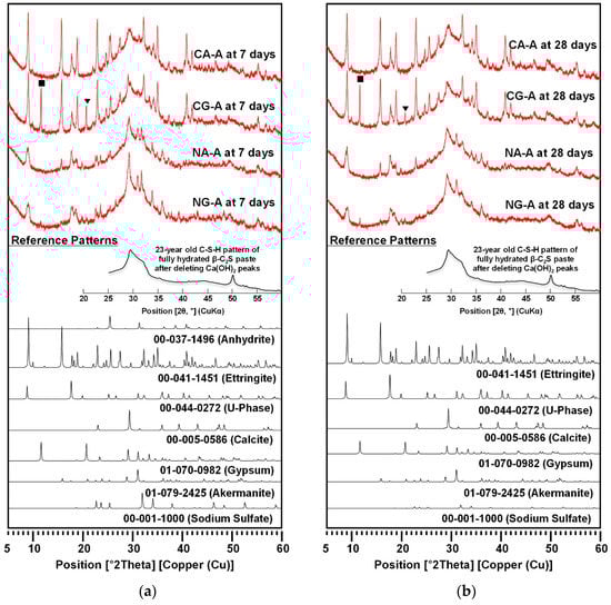The XRD patterns were collected for CA-A, CG-A, NA-A, and NG-A samples at 7 and 28 days as shown in Figure 4, and the phases detected from XRD were listed in Table 4. The XRD data was analyzed using X’Pert HighScore Plus [22] based on reference patterns of the International Center for Diffraction Data (ICDD) PDF-2 database [23]. To identify calcium silicate hydrate (C-S-H), the experimental pattern of 23-year-old C-S-H, measured by Mohan and Taylor [24], was referenced after eliminating the reflections of calcium hydroxide because the reference pattern of C-S-H in the database (i.e., PDF 033-0306) showed only three major peaks (d-spacing = 3.04, 2.79, and 1.82 Å) without amorphous characteristics.