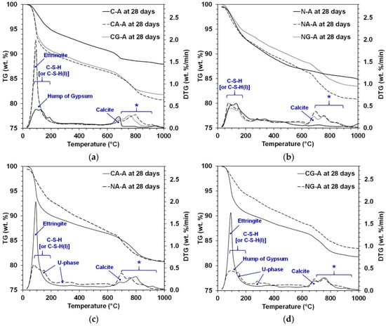 The small hump between 100–150 °C in the DTG of CG-A was attributed to the water loss of gypsum, which corresponded to ~22 wt.% of gypsum weight [30]. Because the added weight of gypsum in the mixture proportion of CG-A was only ~5.7 wt.% and a large portion of the added gypsum was consumed, the DTG peak of the remaining portion of gypsum was also of very limited intensity, although the XRD result of CG-A at 28 days showed intermediate intensities of gypsum peaks. The NG-A sample also had small gypsum peaks in XRD, but a weight loss for gypsum was barely seen in DTG.