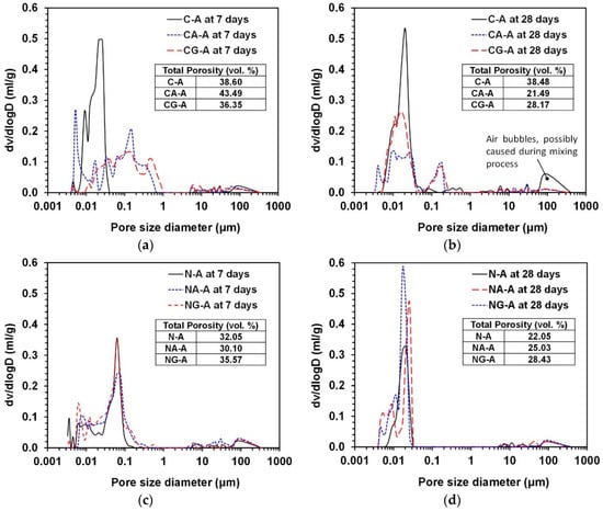 Figure 6 presents the MIP results for the samples at 7 and 28 days. The suitability of the MIP measurement method has been questioned as a valid means of evaluating a real pore size distribution in cement-based systems mainly due to the bottle-neck effect and systematical misallocation of pore sizes [34]; thus, the direct comparison between different labeled samples (e.g., CA-A vs. NG-A) using the MIP result may not be appropriate, and it may show particular inconsistencies with the interpretation of the results of strength testing, XRD, or TGA/DTG. However, the MIP results remain valuable in the current study because they allow a relative comparison of pore size distribution in each mixture proportion between 7 and 28 days.