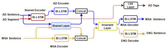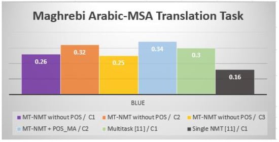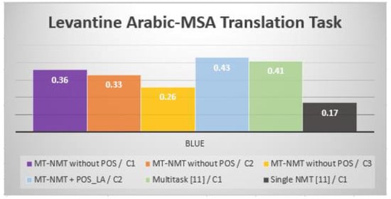 For the translation tasks (see Supplementary Materials), the study used the same parallel corpus used by Laith Baniata et al. []. We had concatenated the Maghrebi Dialects (Moroccan Dialect, Algerian Dialect and Tunisian Dialect) together from the PADIC Corpus and MPCA Corpus [] as well the Levantine Dialects (Jordanian Dialect, Syrian Dialect and Palestinian Dialect) are concatenated together from the same corpora. The Multitask NMT model is trained on 13,805 sentence pairs for Levantine Dialect (LD) and 17,736 sentence pairs for Maghrebi Dialect (MD). The text data was collected from social media, movies, TV shows. For the test set, the Multitask NMT model on 2000 sentence pairs for Levantine Dialect and 2000 sentence pair for Maghrebi Dialect were tested. For the POS tagging task, the dataset described by Kareem Darwish et al. []. were adopted. The adopted dataset is in-of-domain data for machine translation task and the test data used is also from the mentioned dataset. The POS dataset includes a set of 350 tweets for four major Arabic dialects (Egyptian, Levantine, Gulf and Maghrebi).