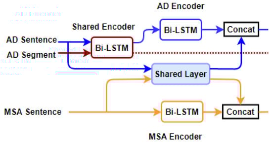The central idea of multi-task learning is the sharing scheme in latent feature space. Latent features can be regarded as the hidden states of Bi-LSTM encoders in the multi-task NMT model. So that, sharing schemes are different in how to group the shared features. Here, a shared-private scheme is used. The shared-private scheme has two feature spaces for each translation task: Bi-LSTM encoder is used to capture task-dependent features and a private Bi-LSTM layer is used to capture the task-invariant features. As shown in Figure 4, each translation task for each Arabic dialect is assigned a private Bi-LSTM layer (LA encoder, MA encoder) and a shared Bi-LSTM layer (shared layer). Formally, for any Arabic dialect sentence in task , its shared representation  can be captured along with task-specific representation :