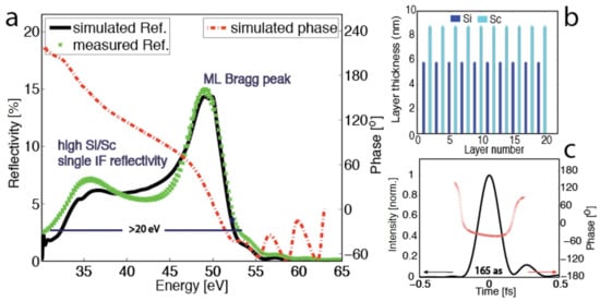 Many attosecond experiments are performed in the spectral range between 30 and 60 eV, which is easy to access with high harmonic sources [50,51,52]. The shortest attosecond pulses in this spectral range could be generated by polarization gating. Sansone et al. realized 130 as long pulses around 40 eV [51]. This and other experiments may benefit from broadband normal incidence EUV optics suitable for attosecond beam guidance and focusing. An aperiodic broadband mirror (/Mo/Si) reflecting between 35 and 50 eV with a reflectivity up to 20% was designed and published by Morlens et al. [53]. In the following section, we present a periodic Si/Sc mirror centered at nearly the same central energy of ≈40 eV with comparable bandwidth to Morlens’ mirror but with periodic layers; it is thus an almost flat phase for a close to dispersion free reflection. This allows for spectrally filtering the high harmonics cut-off from krypton, offering isolated attosecond pulses below 200 as. Its design is chosen such that the high single interface reflectivity of Si and Sc is extended by an appropriate quarter-wave design to a bandwidth of more than 20 eV. Until now, Si/Sc multilayers have mainly been used at energies between 25 and 35 eV [54], just below the Sc -edge. Above this energy, both Si and Sc are highly absorbing, and the number of contributing periods in Si/Sc multilayers is very limited. The normal incidence reflectivity saturates between 35 and 45 eV for only ≈5 periods. The relatively high reflectivity between 5 and 7% is mostly independent of the mirror design due to a high single interface reflectivity of about 2%. This property has been utilized for the design of the following ultra-broadband mirror. Its design is chosen such that the already high Si, Sc reflectivity is extended to the high-energy side for a larger overall bandwidth. A 10-period Si/Sc coating with a period thickness of 14 nm (for a central energy of ≈50 eV) was chosen (Figure 1b).