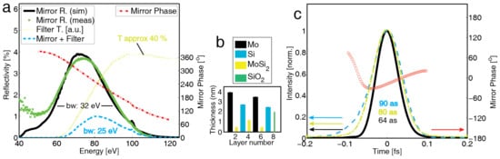 Shorter pulses require even more bandwidth and thus necessarily higher central energies. The development of ultra-broad high harmonic cut-off spectra with sufficiently high photon flux in the spectral range (between 60 and 100 eV) and the availability of appropriate thin metal filters and broadband high-reflectivity multilayer optics suggest this energy range for the generation of ever shorter ultrashort pulses. The high harmonic-generated EUV cut-off spectrum at about 100 eV matches the high reflectivity spectral band of Mo/Si multilayer mirrors; this material combination was thus chosen. The generation of 80 as long pulses [55] requires at least a 25 eV (full-width-at-half-maximum (FWHM)) bandwidth (for a Gaussian spectrum) and is given by the multiplication of both the spectrum of the optics and the high harmonic spectrum from which the single pulse is being filtered. As will be presented in the following paragraph, this requires an HHG spectrum which exceeds the chirp-free cut-off region, ranging in the lower energy plateau region, which is known to be positively chirped. This phase behavior (positive chirp at low energies, negligible chirp at high energies) exactly opposes that of a thin zirconium (Zr) filter, which was used in this experimental setup anyway to filter the laser light from the EUV propagation path. As the filter indispensably compensates for most of the HHG chirp, a chirp-less but broadband attosecond mirror is required. The penetration depth and thus the maximum number of usable bi-layers is limited by the attosecond pulse length. A four-layer Mo/Si EUV coating centered at 70 eV, with a bandwidth of 32 eV (FWHM), was designed for the coating of the inner part of the double mirror (Figure 2b). Its reflectivity was measured (green stars in Figure 2a) and is in good agreement with the simulations. Figure 2 concludes the spectral (panel a) and the temporal (panel c) characteristics of this bandpass.