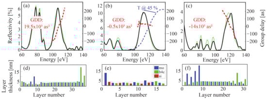 The multilayer designs were calculated and optimized by a Fresnel equation thin film code coupled to a needle optimization algorithm [44]. The mirrors were designed such that the GDD is almost maximum and mostly linear within the final attosecond pulse spectrum. Small shifts of the mirror spectrum due to the thin metal filter or the shape of the high harmonic cut-off spectrum were estimated and considered in the designs. The calculated designs were optimized for additional suppressed reflectivity contributions in the near vicinity of the main Bragg peak and were tested for stability against small layer thickness deviations. The final multilayer coating designs are displayed in the lower panels d–f of Figure 3.