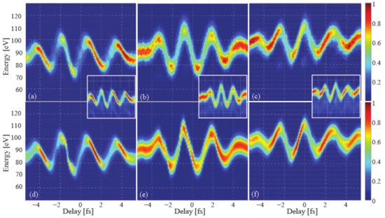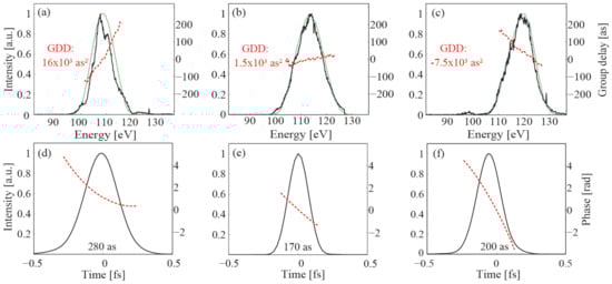 To access the temporal intensity profile of the synthesized attosecond pulses and their frequency sweep, we performed a frequency-resolved optical gating (FROG) analysis [63] of the acquired streaking spectrograms. This method gives not only access to a full characterization of the laser’s vector potential, it allows as well to characterize the spectral intensity distribution and the group delay variation [64,65] of the final attosecond EUV pulse reflected off the mirrors after passing the filter, allowing for a direct comparison of its GDD with the design values of the mirrors’ GDD. The resultant streaking spectrograms recorded with the three mirrors of Figure 3a–c are depicted in Figure 4a–c, along with their corresponding FROG retrievals in Figure 4d–f, respectively.