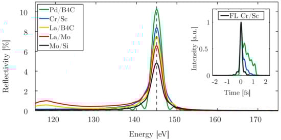 The parameters were chosen as a trade-off between temporal and spectral resolution for attosecond experiments offering a high resolution. The simulations reveal an only weak suppression of (unwanted) low-energy out-of-band radiation in the range of ≈120 eV with lanthanum (La)-based multilayer mirrors (La/Mo, La/). The typically used and necessary metal filter for blocking the near-infrared laser (typically a 200 nm thick Pd filter) cannot eliminate the out-of-band radiation due to its transmission properties. Therefore, (chirped) plateau harmonics are not sufficiently suppressed by such multilayer mirrors. This is a prerequisite for filtering single isolated attosecond pulses out of the cut-off region of the high harmonic spectrum. The suppression of low-energy (out-of-band) radiation is crucial for attosecond spectroscopy experiments for, e.g., direct observation of electron propagation [34] or delay measurements [68]. Mo/Si mirrors are well established and widely used in attosecond experiments at photon energies below the silicon -edge around ≈100 eV. This material system suffers from very low reflectivity above 100 eV. On the one hand, other molybdenum (Mo)-based multilayer systems like Mo/, Mo/Y, Mo/Be, or Mo/Sr can provide a higher suppression of out-of-band radiation (in the case of Mo/) together with a higher reflectivity (Mo/Y, Mo/Be, Mo/Sr) [69,70,71,72]. However, on the other hand, they suffer from strong spectral modulations near the main reflectivity Bragg peak due to Kiessig fringes. As a result, this introduces additional group delay dispersion, which broadens the pulse in the time domain. Furthermore, beryllium (Be) is strongly toxic, and Mo/Sr is not stable since it shows long-term degradation. This limits experimental adoption of these materials. A comparison of the reflection in the time domain is shown in the small inset of Figure 6. The multilayer mirrors are composed of Cr/Sc and the highly reflective system Pd/ [73]. The simulation takes the transmission through a 200 nm thick Pd filter (including its spectral phase) into account. The pulse reflection of the Cr/Sc mirror is close to its Fourier-limit and exhibits a Gaussian pulse shape, whereas the Pd/ system clearly shows unwanted temporal pulse broadening due to group delay dispersion. Temporal modulations resulting from the multilayer reflectivity fringes are also present. The Cr/Sc material system combines all the advantages required for attosecond pulse applications: sufficient photon throughput due to the optimized reflectivity [43], suppression of out-of-band radiation (in the case of lanthanum-based systems, a thicker filter could increase the suppression in the 120 eV range, accompanied by a lower overall throughput), and a nearly Gaussian pulse profile close to the Fourier-limit, both in the temporal and spectral domain.