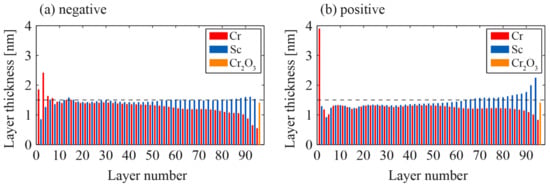 The two different aperiodic Cr/Sc multilayer mirrors were optimized by the thin film program Optilayer (version 8.85), which is described in Section 2. While the first multilayer mirror was designed for the introduction of an averaged negative chirp of approximately to compensate for a possible positive chirp of the high harmonic plateau, a second mirror with similar parameters was designed to introduce an averaged positive chirp of approximately . Both mirrors were designed such that their central energy coincides with the -edge of Ar (326.3 eV) at an incidence angle of . The optimized stack designs are shown in Figure 8, where the negative (a) and the positive (b) designs consist of around 95 individual layers.