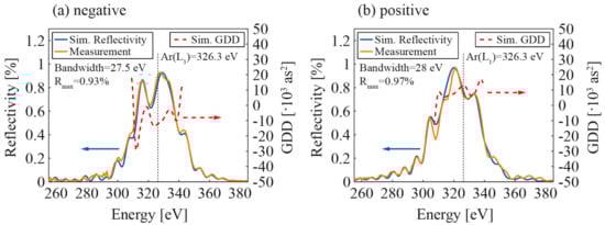 Soft X-ray reflectometry measurements were carried out at the beamline 6.3.2 of the ALS [41] (advanced light source) in Berkeley to retrieve the reflectivity profile in the energy range for which the mirror designs target an incidence angle of . A comparison of the measured and simulated soft X-ray reflectivity for both chirped mirrors is shown in Figure 9.