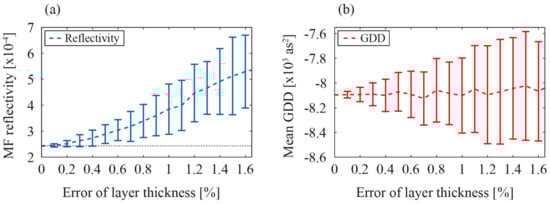 where N is the total number of wavelength samplings with integer i representing the position of the sample, with samples being equally spaced. One hundred designs were averaged per allowed error, and both the reflectivity and the GDD deviations were calculated. Designs with an overall stack height deviation of more than 0.8% were left out due to a discrepancy with parallel profilometry investigations. From Figure 10a, it can be deduced that the average random thickness error is less than 0.5%, corresponding to an average layer thickness error of approximately 0.05 angstrom.