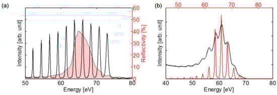 An EUV multilayer mirror design and an EUV spectrum that have been used for RABBITT measurements on tungsten [85] are depicted in Figure 11a. The mirror reflectivity is centered around 65 eV with a peak reflectivity of 40% and a bandwidth of 5 eV (FWHM) supporting about three high harmonics at a fundamental wavelength of 1030 nm. The EUV spectrum calculated from this mirror design fits well to the measured photoelectron spectrum from a tungsten (110) single crystal (Figure 11b), which features broader peaks due to the electronic band structure and a tail of slower secondary electrons.