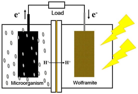 Schematic representation of the enhanced performance of an MFC with a wolframite photocatalyst.