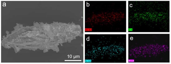SEM image of natural wolframite (a) and energy dispersive X-ray spectrometry (EDX) mapping of different elements (b–e).