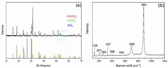 Figure 3b shows the Raman spectrum of natural wolframite. The bands at 129, 207, 262, 327, 398, 540, 699, and 882 cm−1 correspond to the characteristic bands of wolframite, in agreement with previous studies [,,]. In detail, the strongest sharp band at 882 cm−1 was assigned to the ν1 symmetric Ag mode of terminal WO2. The band located at 699 cm−1 was attributed to antisymmetric bridging mode linking with the tungstate chain. The bands at 262 cm−1 and 207 cm−1 were assigned to the ν4 bending modes in the tungstate anion, while the band at 327 cm−1 is assigned to ν2 bending mode. The band at 125 cm−1 was induced by lattice vibration [].