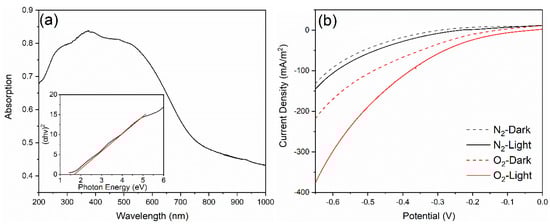 UV-Vis of natural wolframite (a) and linear sweep voltammetry (LSV) curves under dark/light conditions in O2/N2 (b).