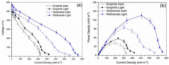 Polarization (a) and power density curves (b) of MFCs equipped with wolframite-coated graphite cathodes and bare graphite cathodes under dark/light conditions.