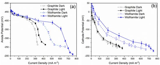 It should be pointed out that an enhanced power density, implying more efficient cathodic reactions, happened with the wolframite photocathode. Potential curves for four different types of photo/dark cathodes were obtained under actual operating conditions (Figure 6). Both anode and cathode potentials dropped gradually from the open circuit condition to short-circuit and a linear increase relationship was observed because of the domination of ohmic polarization. As far as the microbial anode was concerned, a similar potential of approximately −455 mV was recorded under open circuit conditions, which was consistent with previously reported MFCs []. Moreover, significant potential was presented when the current densities were limited by the electron transfer process on the electrode surface (Figure 5a). However, the turning position positively shifted from 340 mA·m−2 to 620 mA·m−2 when using the wolframite photocathode. In addition, higher current densities and more negative potentials, indicating enhanced anodic bio-activity, occurred in the anode chamber. As shown in Figure 5b, the cathode potentials were more positive when a wolframite coated cathode was used rather than a bare graphite electrode in the MFC. The cell voltage of the MFC was calculated by Ecell = Ecathode − Eanode, therefore, the highest voltage was observed in the wolframite photocathode MFC system. It is worth mentioning that the potential of the wolframite-coated cathode was further increased under light irradiation (Figure 6b). A higher potential, indicating a better ability for receiving electrons, was observed for the wolframite photocathode. The results unambiguously demonstrated that a solar-driven MFC was successfully built based on the synergistic effect of a wolframite photocathode and bioanode. Such cathodic potentials and reaction properties demonstrated that the natural wolframite was an efficient cathode material for electron accepting in MFCs.