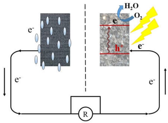As we all know, sunlight sustains the processes of all life, and is the most important energy source on Earth. This renewable and clean solar energy can be utilized by semiconductor photocatalytic technology, which has broad prospects in treating environmental pollution and energy-saving []. Semiconducting materials can be excited by light irradiation and photoelectron-hole pairs can be generated in the lattices, which can improve both the internal conductivity for enlarged charge density and the oxidation kinetics on the surface []. Ren et al. first demonstrated the positive relationship between electroactive microorganisms and semiconducting iron/manganese oxides minerals at Karst areas in natural environments []. Moreover, enhancing the electron transfer process between a hematite/birnessite photoelectrode and different microorganisms under visible light was demonstrated, and the interaction between microbes and semiconducting minerals is becoming a hot spot in the interdisciplinary field of geomicrobiology [,,,]. Due to the abundant production, environmentally friendly attributes, and convenient access, abundant natural semiconducting minerals may be considered as alternatives for photocathode catalysts.