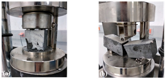 Strength test setup: (a) compressive strength test; (b) flexural strength test.