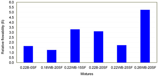 Figure 2 presents relative flowability of six key mixtures. The relative flowability (Γm) value of the mixture containing a higher amount of SF at the same WB was lower than those of the mixtures with low SF content. For instance, the Γm of mixture 0.22WB-25SF containing 25% SF was 1.72, whereas that of mixture 0.22WB-15SF containing 15% SF was 3.31. When the replacement percentage of SF increases and the same amount of SP is used, the reduction of Γm in the mixture is attributed to the high specific surface area of SF.