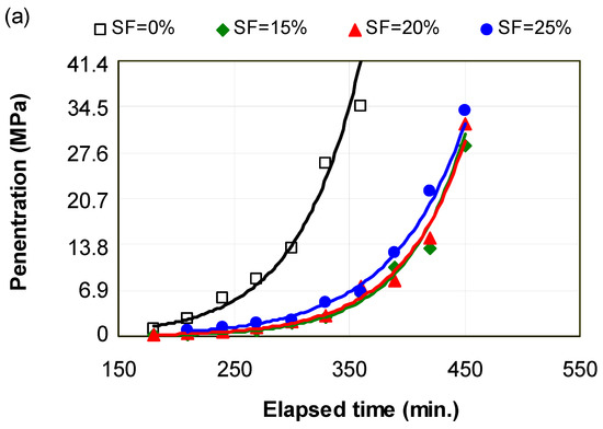 The setting time of RPC was determined for six key mixtures according to ASTM C403 [29]. The initial and final set times were calculated from the plot of penetration resistance versus time elapsed from the initial contact of water and binder using simple linear regression from Equation (3):