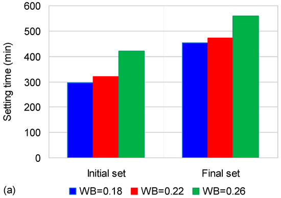 As observed from Figure 4a, both the initial and final setting times increased with the increase in WB. While the initial increase of WB from 0.18 to 0.22 has little effect on both the initial and final set time, a further increase of WB from 0.22 to 0.26 produced significant influences on both setting times. It seems that a higher WB plays a more critical role in controlling setting time in RPC mixtures.