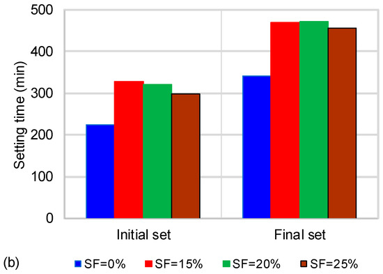 Figure 4b shows the effect of SF on setting time. At a high SF content, the addition of SF to a binary cement system exhibits the increase in setting time. Lohtia and Joshi [33] reported that the delay in setting time of concrete containing a high amount of SF was attributed to the combined effect of lower cement content and the relatively high dosage of superplasticizers that is needed for the high amount of silica fume that is added to concrete.