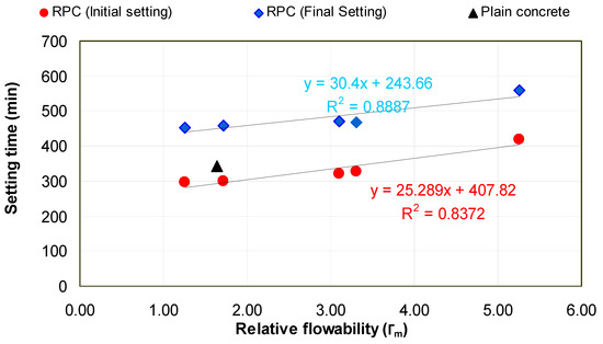 Figure 5 shows the relationship between the relative flowability and the setting time of RPC. Setting time and Γm are proportional to each other. In other words, the mixture with lower Γm results in fast setting times, regardless of the initial and final setting times. For instance, while the initial and final setting times of the mixture 0.18WB-20SF with the lowest Γm of 1.25 are 297 min and 453 min, respectively, those of the mixture 0.26WB-20SF with the highest Γm of 5.25 are 420 min and 558 min, respectively.