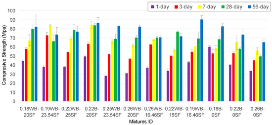 The compressive strength development of all of the RPC mixtures is presented in Figure 6. The compressive strength of RPC varies and depends on the combination of SF content, WB, and SP dosage to adjust flowability. In general, the compressive strength of the RPC mixture was increased with the increase in curing time. However, for mixtures 0.19WB-23.54SF, 0.22WB-25SF, and 0.22WB-15SF, the drop in the compressive strength value at the age of 56 days was observed. It should be noted that the permeable porosities of these 56-day samples were higher than those of the 28-day samples, as shown in Table 3. These results indicate that the number of parameters, including WB and SF content, influence the compressive strength development of RPC. The influence of these parameters together with the effect of curing condition will be addressed in the following sections.