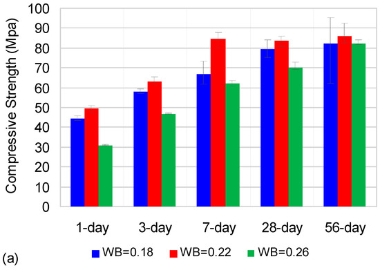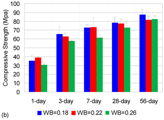 Figure 7 illustrates the effect of the WB and curing temperature on the compressive strength for mixtures containing 20% SF at all ages. As the WB increased from 0.18 to 0.22, the compressive strength of the RPC mixture increased, but a further increase of WB from 0.22 to 0.26 led to a significant drop in the compressive strength, except for the 56-day specimen. The reduction of strength over increasing WB can be explained as follows: in general, the porosity of concrete increases with the decrease in the degree of hydration when the WB increases. This means that a higher water content leads to increasing the intensity of pore formation, and eventually decreases the compressive strength of concrete [37]. However, RPC is a special type of concrete containing a relatively higher SF content that increases the water demand of the mixture due to the higher specific surface area of SF. Thus, it seems that decreasing the WB below the certain optimum point results in a decrease of the compressive strength due to the insufficient hydration of the binder inside the concrete.